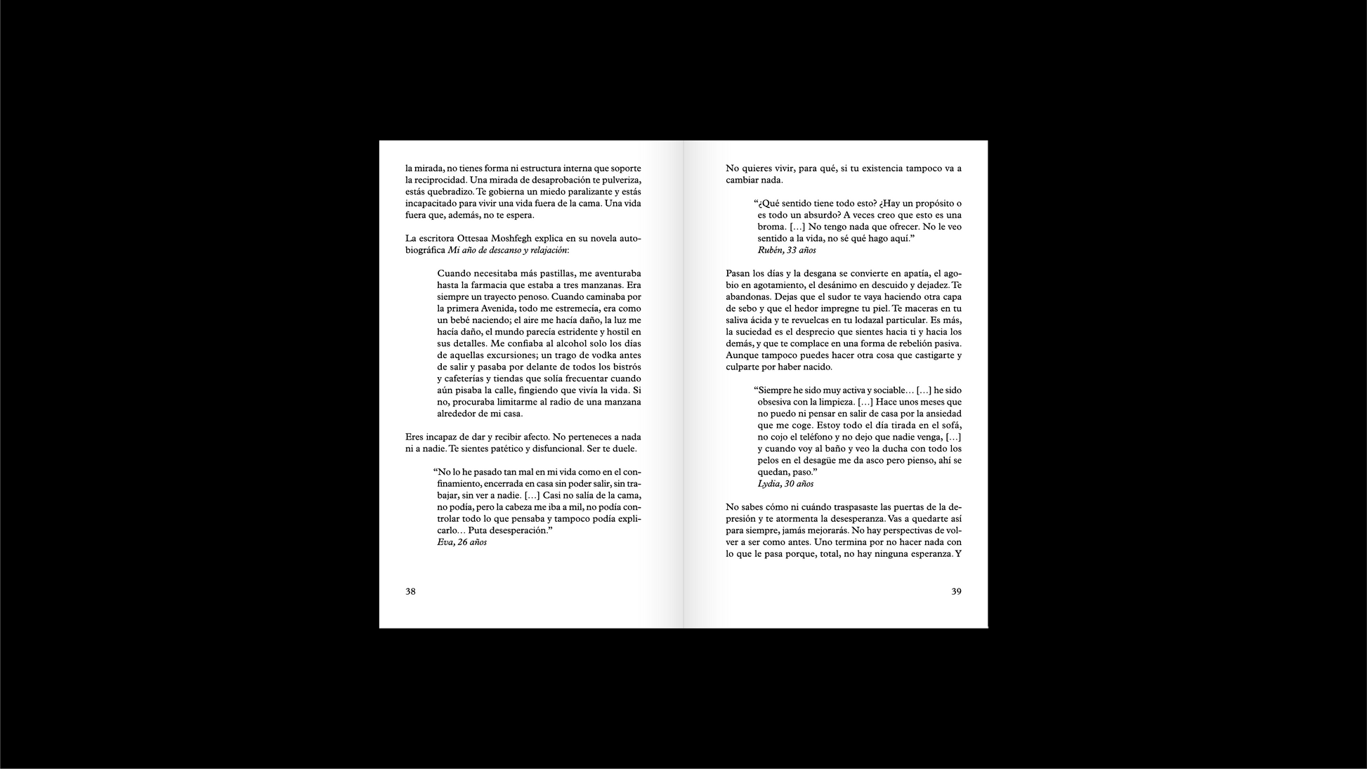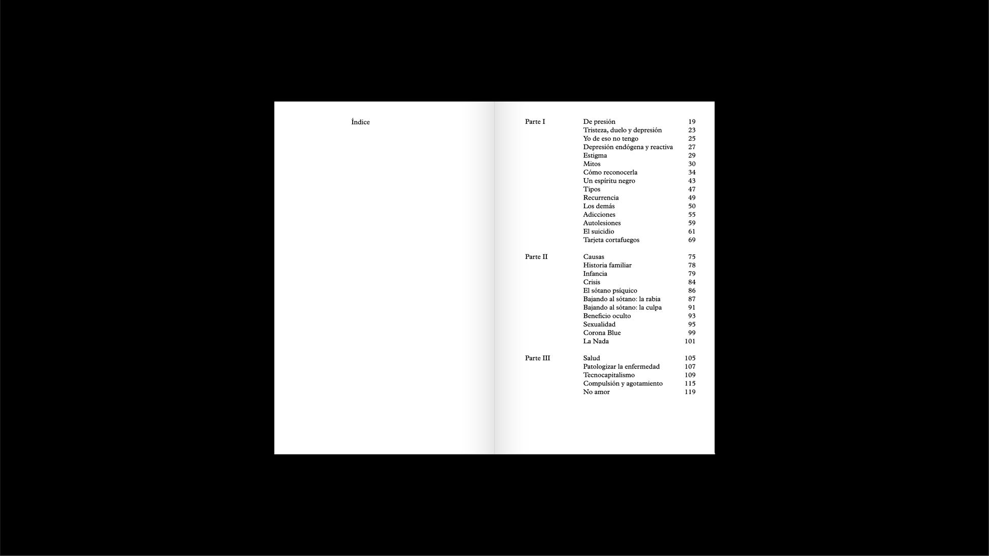 Espero que al leer este libro tengas la expectativa de una lectura verdaderamente deprimente. No da un mensaje resiliente o positivista, ni te ayuda a salir de la depresión en 8 pasos. No entretiene, ni hace que te olvides de tus problemas. De todas formas, ¿por qué tanto espanto con las emociones oscuras? Desconfío de aquellas personas que siempre están felices o de buen humor y se despiertan por las mañanas bailando entusiastas. ¿Pero de qué te quejas? Tienes tantas comodidades, no te falta de nada, hay gente peor que tú ¿y no puedes con tu vida?